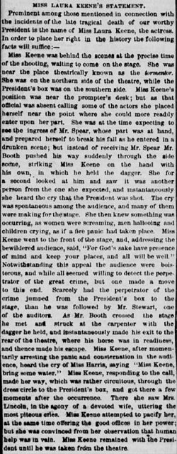 What happened that fateful night is etched in history. Actor John Wilkes Booth fatally shot Lincoln, while the President watched the play from the presidential box, then leaped to the stage and fled the scene. Keene was in the wings, about to go onstage, when the shooting occurred.