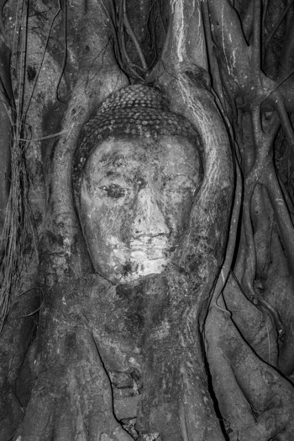 This may provide some insight into why the head of the Buddha came to be in the banyan tree at Wat Mahathat. It may be that, at some point after 1767, an enterprising looter carried off the head, only to realize he could not take it away. He left it hidden in the banyan tree, but never came back to claim his prize. Over the years, the tree continued to grow around the head, and it now lies nestled in its roots.