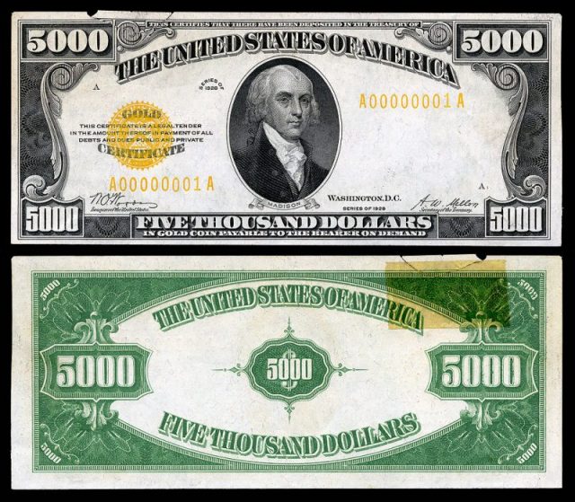 At that time, extremely large banknotes were issued in denominations of $10,000 with a portrait of Salmon P. Chase, Secretary of the Treasury during Abraham Lincoln’s presidency, a $500 bill featuring President Grover Cleveland, a $5,000 note with President James Madison, and the highest value ever created for U.S. currency – a series 1934 $100,000 gold certificate with President Woodrow Wilson on the front.