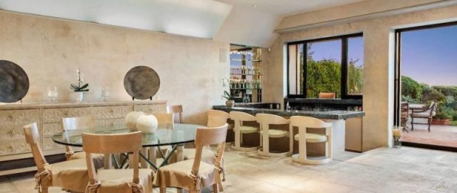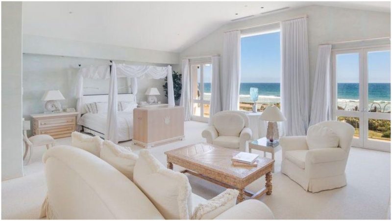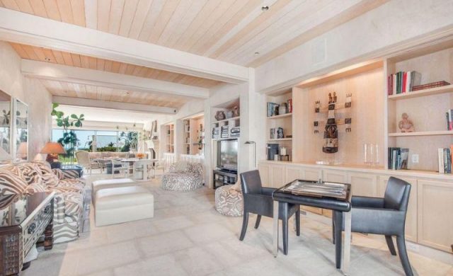 The elevator-equipped home, with seven bedrooms and nine bathrooms, has “living, dining and entertaining space with scads of built-ins, a fireplace and a walk-in wet bar plus a spacious eat-in kitchen with commercial-grade range,” reported Variety. “Under a vaulted ceiling with head-on ocean and sunset view, the airy second-floor master suite encompasses a private terrace, two bathrooms, a steam room, and a hair salon.” Yes, a hair salon.