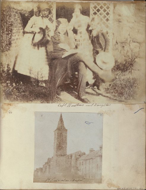Captain Hawkes and his Daughters, circa 1850. Salted paper print from a Calotype negative reimagined. Attributed to Scottish photographer Thomas Rodger (1832 – 1883).