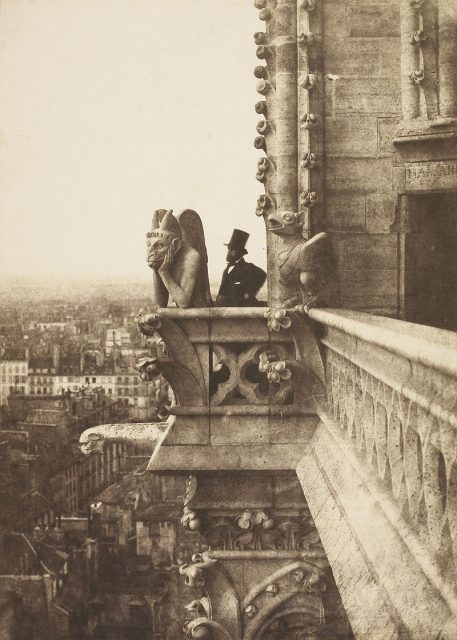 ‘The Vampire’ – Painter/photographer Henri Le Secq poses behind a gargoyle of Notre-Dame de Paris. Photograph taken by Charles Nègre, 1853.