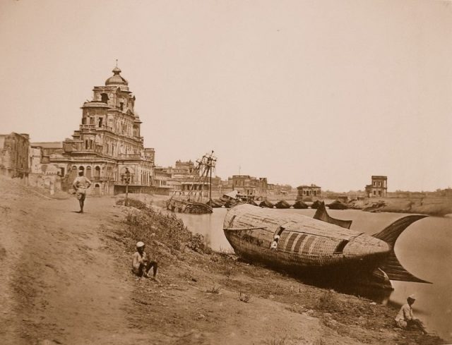 The Chattar Manzil Palace and the Royal Boat of Oude on the Gomti River in Lucknow, India. Photograph taken by Felice Beato, 1858. Albumen silver print.