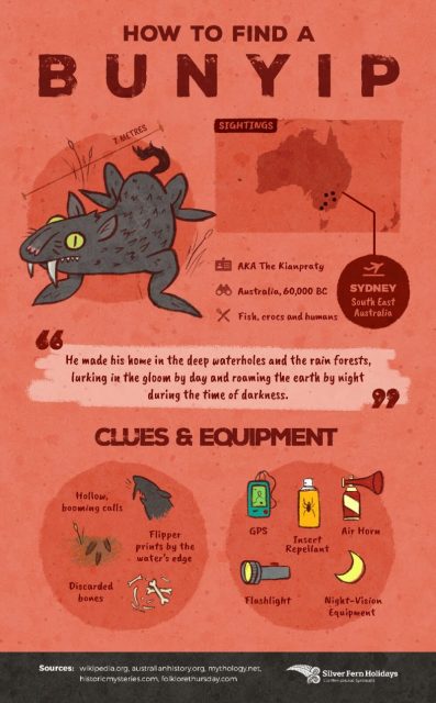 The lurking legend from Down Under is 23 feet (7 meters) long and a hollow, booming sound is heard when it comes near. Gutsy travelers can use the epic flight to Oz to bone up on its habits, which funnily enough include leaving piles of discarded bones.
