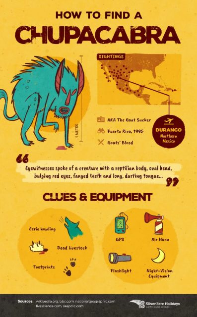 Getting someone’s goat takes on a whole new meaning with the chupacabra. Its other name is “The Goat Sucker” and this native of Mexico and Puerto Rico likes nothing more than to chomp on an unsuspecting billy!
