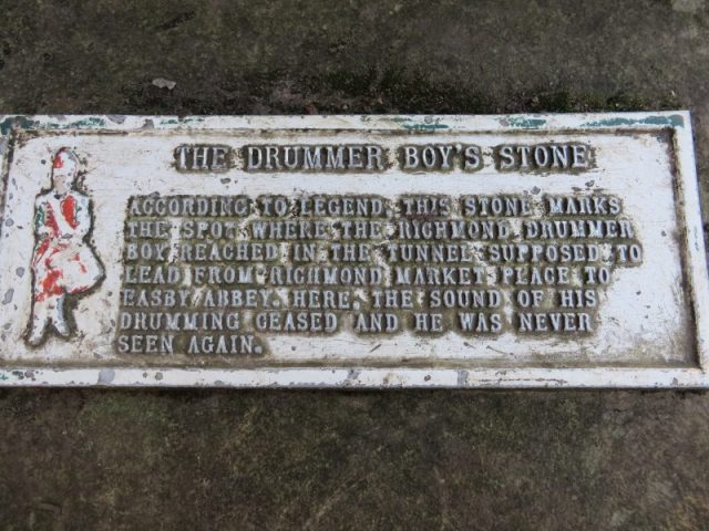 “According to legend, this stone marks the spot where the Richmond Drummer Boy reached in the tunnel supposed to lead from Richmond Market Place to Easby Abbey. Here, the drumming ceased and he was never seen again.”