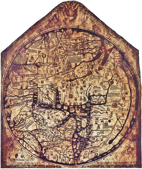 It is important to note that this particular Mappa Mundi is based on older depictions of the known world, such as the Ebstorf Map, destroyed during the Allied bombing of Hannover in 1943, as well as the Psalter World Map ― a small-sized atlas which remains preserved at the British Library in London. Both of these maps stand by the theory of a spherical Earth.