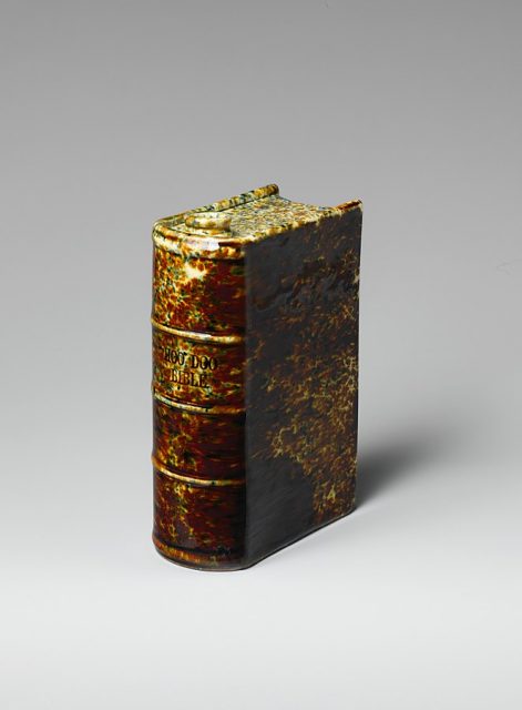 One method used to drink unnoticed was by hiding booze in a fake book, such as this deceptively designed earthenware flask. A more standard hip flask might also be hidden inside a hollowed-out real book.