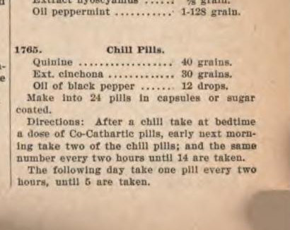 An 1897 book by Michael Griffiths, titled Non-secret Formulas: A Collection of Over Four Thousand Formulas and One Thousand Prize Prescriptions for the Use of Physicians and Druggists, has another recipe named chill pills that includes quinine, black pepper, and cinchona extract. Both of these books can be accessed for free on Google Books.