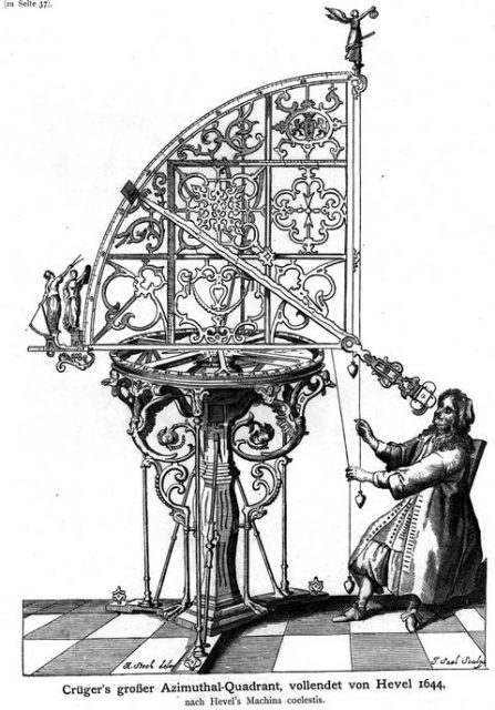 He was a brewer by trade and had studied law, but, upon the death of Krüger in 1639, Hevelius decided to become a full-time astronomer with his main focus on the Moon. Coming from a wealthy brewing family, he was able to put his full attention to his work. He built an observatory on the roof of his house and, later on, filled it with telescopes such as the large Keplerian telescope with a 150-foot focal length and other astronomy tools calling it Sternenberg or the “Star Castle.” However, even amidst pressure from colleagues to rely more on telescopes, Hevelius always maintained he could get just as accurate mappings simply with a quadrant and alidade.
