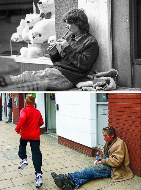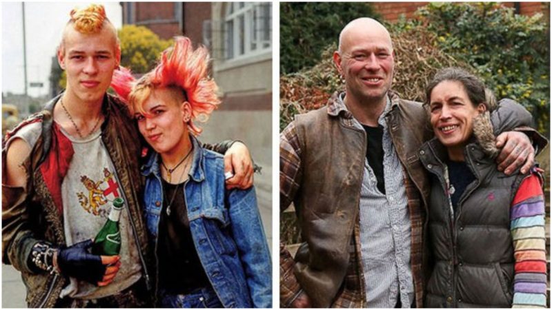 The sedate young man making his way along the rainy street on crutches in 1980 has been replaced by a middle-aged purple-haired biker cheerfully wielding his walking sticks for the camera in 2016.