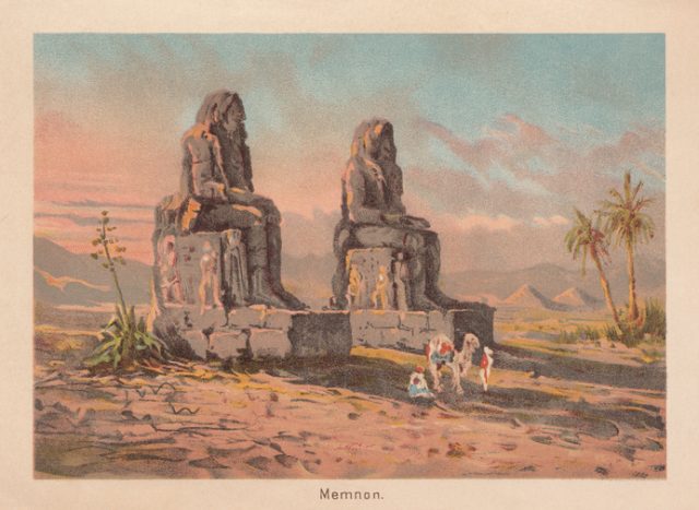 The mysterious sound also helped the name Memnon stick for the figures, a name adopted from ancient Greek mythology — according to which, Memnon was born to Eos, goddess of the Dawn, and he loses his life during the Trojan War. He was among those done away with by Achilles as revenge for his befallen dear friend Patroclus. The strange sound from the cracks of the Colossus was said to be Memnon calling for his mother every morning.