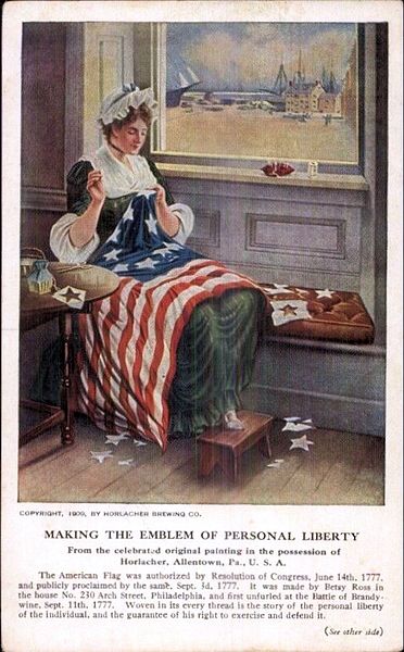 It’s contained in the historical record that Betsy Ross made flags for the Pennsylvania navy during the war. She also lost her husband when he was killed by a gunpowder explosion while on militia duty at the Philadelphia waterfront. Following his death, Betsy acquired his property and kept the upholstery business going, working day and night to make flags.