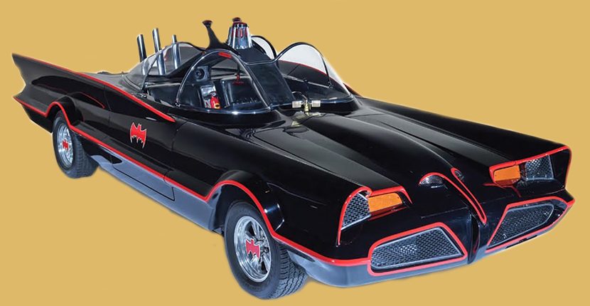 The Batmobile – Batman, 1966. Invented as a red car in the original comic book, the vehicle driven by Batman has appeared in so many different mediums. The most iconic, though, is the Batmobile seen in the mid-1960s Adam West TV show. It was a 1955 Lincoln Futura concept car sold to car customizer king George Barris for $1 and then put through three weeks of intense transformation, from a Bat deflector to a Bat-glove compartment to a Bat-turn lever releasing a parachute. When it had to actually move, problems popped up due to the age of the car: it overheated, the battery went dead, and the expensive tires kept blowing. Still, this Batmobile was purchased at an auction in January 2013 for $4.6 million by an Arizona businessman.