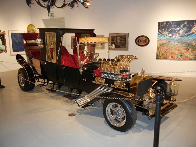 One of the earlest TV cars, the Munster Koach Model-T Hot Rod/Hearse Hybrid — The Munsters, 1964. Made by George Barris, it cost $18,000.00 to build with its “blood red” interior, spider-web headlights, Jahns high-compression pistons, an Isky camshaft, Bobby Barr racing headers, and 10 Carter carbs plated in chrome. It also had a manual gearbox, brass fender and radiator, and was painted Gloss Black Pearl.