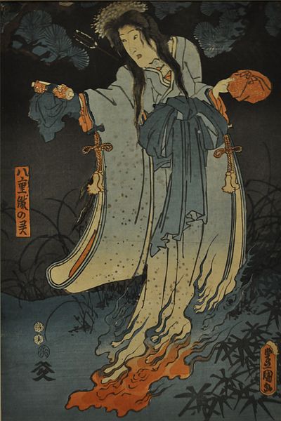 In Maruyama Ōkyo’s famous 18th century painting The Ghost of Oyuki, the modern image of the Yurei is presented: pale, wearing white, limp hands. According to the story connected to the painting, Okyo had a mistress who died young and Okyo grieved deeply. Her spirit appeared to him in a dream one night as a Yurei and, to try to deal with his sorrow, he painted her portrait.