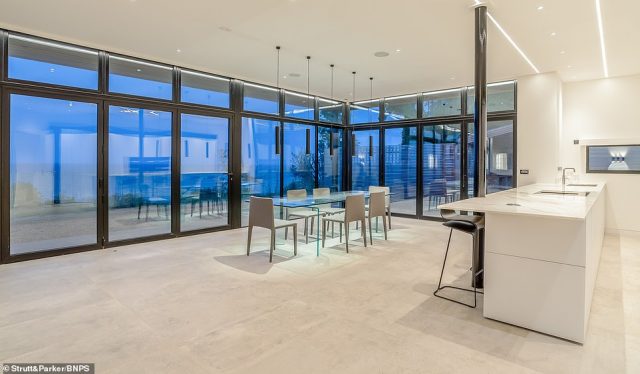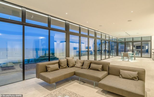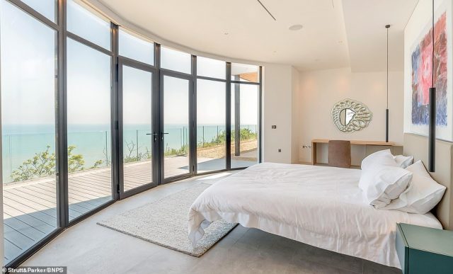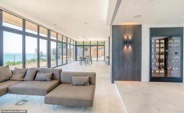 Most of the walls which face the sea are entirely made of windows to let you take advantage of a truly spectacular view which encompasses the White Cliffs of Dover and the English Channel, with France on the other side. There is a modern kitchen, a dining area, and a wine cellar, as well as four bedrooms, a cloakroom, a study, and a plant room.