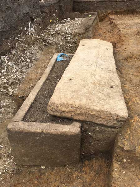It is known that an area of land near the banks of the Thames was an important burial site. Just when the archeological team thought they were about finished, they uncovered a stone sarcophagus built into the side of a wall which may have been part of a mausoleum. The lid had been moved causing a large crack indicating a grave robbery, probably in the 18th century.