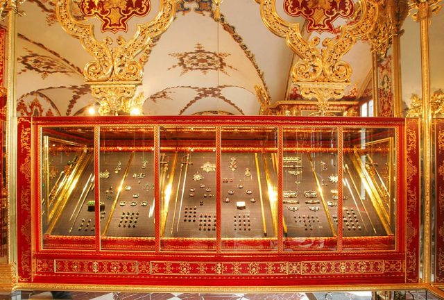 The Green Vault held ten sets of jewels, including the three which have gone missing. The collection had originally been put together in about 1723 by Augustus the Strong, who was first an elector of Saxony, and later became King of Poland. Each of the missing sets consists of about 37 pieces of jewelry and contains sapphires, emeralds, and rubies in addition to the diamonds.