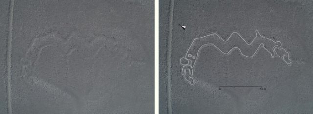 Team leader Masato Sakai said in a recent media statement, “It is in an area that we often investigated, but we did not know the geoglyphs existed.” He cited one new drawing in particular that appears to have a human shape but is very large — about 13 feet tall and six-and-a-half feet wide. All the etchings are very simple in shape, though not in scale. Each one looks as though it might have been drawn by a child, the lines are so plain and elementary.