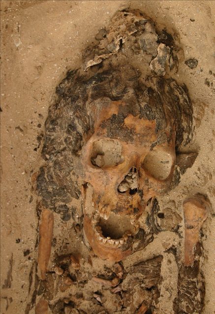 Initially, researchers thought that the head cones were organic and actually solid lumps of perfumed fat that melted over the heads of the women as a kind of scented hair gel or tonic. However the findings from Amarna seem to negate that theory. The cones weren’t solid. They were actually hollow shells folded around some type of brown-black organic matter the archaeologists think may be fabric. Both of the head cones had chemical signatures of decayed wax. Thus, the team surmised that they were made of beeswax, which was the only biological wax known to be used in ancient Egypt. Moreover, no traces of wax were found in the hair of the most well-preserved remains.