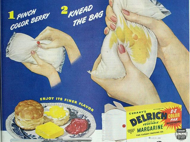 Manufacturers got around this red tape by having consumers do the mixing themselves. A vintage ad for Cudahy’s Delrich margarine from 1948 shows how a simple pinch of the bag can release yellow coloring into the white product. The idea was a capsule containing dye could be inserted separately at home. It was a crafty, if legitimate, practice that boosted sales by millions of dollars in the early 20th century.