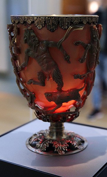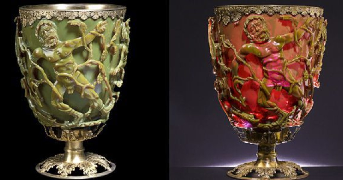 The cup is a glass cage cup, but what makes it a real marvel is the fact that it looks jade green when lit from the front, but if it’s lit from behind it looks blood red. How is this possible? The cup was created using the earliest-known example of applied nanotechnology.