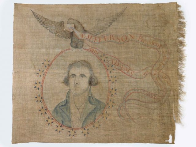 The National Museum of American History – where the banner now resides – describes it as “one of the earliest surviving textiles carrying partisan imagery, created at the dawn of the first American party system in which power passed from Federalists to Jeffersonian Republicans.”