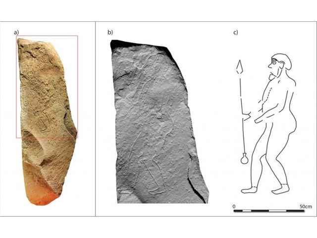 In 2017, near Perth in Scotland, road workers found an ancient monolith which has a carved curious-looking figure of a human with a spear. It was found 300 feet underground while new roads were under construction. The rock measures about six and one third feet by two feet wide and weighs almost a ton. While the carving is hard to see in some places, 3D photography has brought the image out so it can be better studied.
