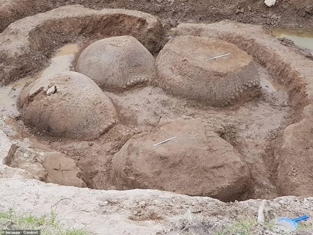 Recently, Juan de Dios Sota, a farmer living near Buenos Aires in Argentina, was putting his cattle out to pasture when he noticed two strange lumps in a dried up riverbed. When paleontologists were notified, they came on the site and found two large fossil shells of glyptodons, and, as they were excavating, they found two smaller shells which could have made up a family unit. The placement of the fossils indicated they were going in the same direction but for one which seems to be looking back toward the others. The largest of the shells was about five feet long and at least two inches thick.