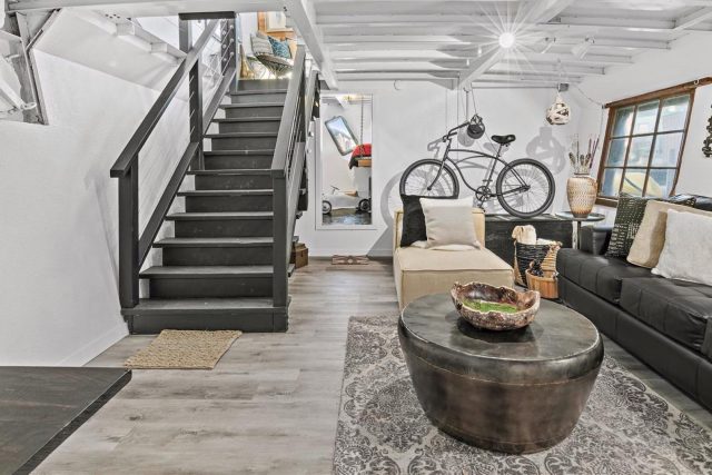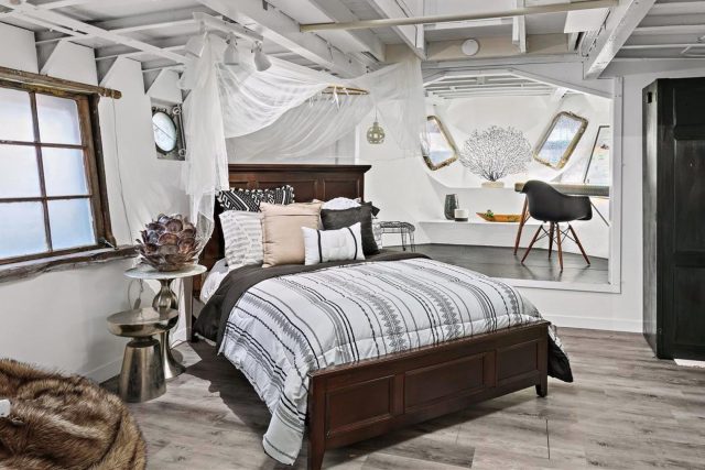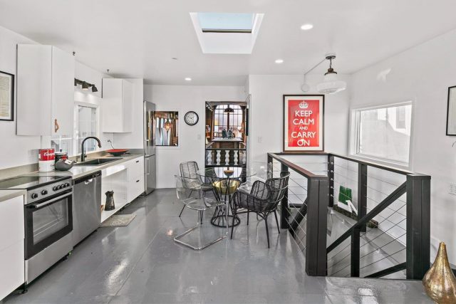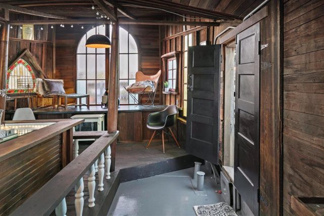 The new owner clearly took the realtor’s words to heart. The boat retains it’s weathered, whimsical, and even slightly dilapidated-looking exterior, but the interior is a different story. It contains two bedrooms, skylights, and an updated kitchen and bathroom. The main room on the first floor has remained largely untouched since Silverstein purchased it back in the ‘60s, and is funky and a little bohemian, and full of original wood. The room also has a large stained-glass window, and gets plenty of natural light from regular windows on the other side of the room and skylights overhead.