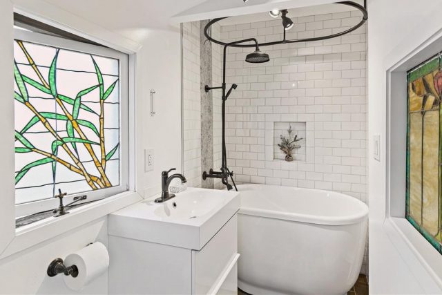 Much of the rest of Shel Silverstein’s former houseboat has been redone with lots of white to maximize the available light, and the kitchen has been fitted with white modern cabinets and stainless steel appliances. The bathroom features two more beautiful stained-glass windows, allowing light to enter the space, but retaining privacy.