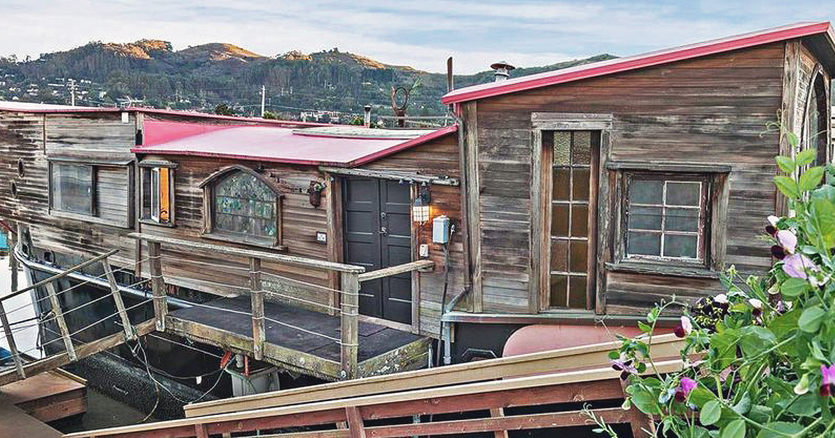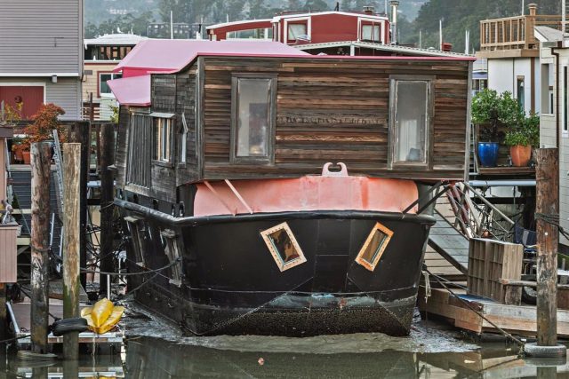 The boat has been moored in Sausalito, California, an area that, while not particularly glamorous, is very expensive. In the 1950s and ‘60s, the area was full of metal, wood, and other scrap, as well as abandoned boats. A number of artistic types and drifters made use of that material to construct living spaces for themselves, since it was much more affordable than more traditional housing in the Bay area.