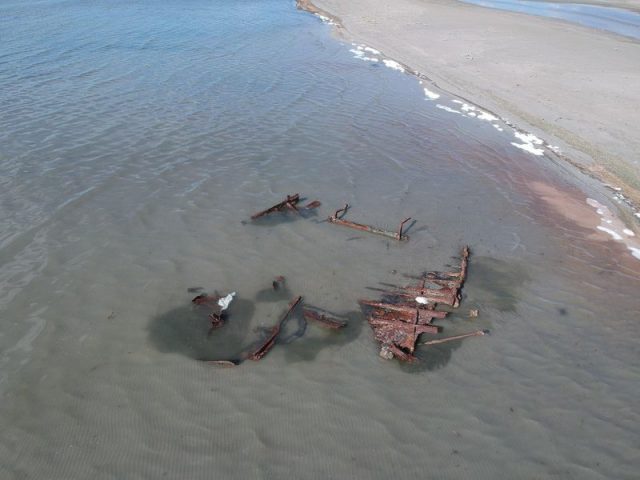 The shipwreck came to the attention of the media after the state’s Park Service posted a picture of the wreck on their Facebook page. The steel boat is near the south shore of the lake, and was exposed when winds associated with the storm caused waves which eroded the lake bed, washing away sand that had previously covered the wreck. The wreckage is that of a steel boat that may be from the early years of the twentieth century.