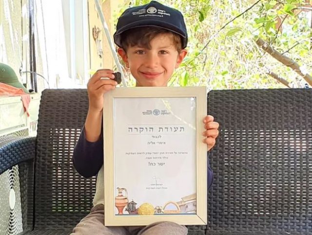 Imri probably didn’t fully understand the significance of his discovery until his parents spoke with the IAA. Shortly thereafter, because Imri displayed such great civic mindedness by turning the antiquity over instead of squirreling it away, he was rewarded with a Citizen’s Award by the government and the IAA. No doubt Imri will continue to hunt for more rare treasures once he is able to walk freely again along the border.
