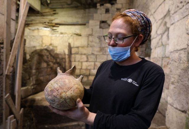 Tehila Sadiel shows a ceramic dating to the Umayyad period (7th-8th century CE), discovered at a subterranean system hewn in the bedrock beneath a 1400-year-old building near the Western Wall in Jerusalem’s Old City (Photo by MENAHEM KAHANA/AFP via Getty Images)