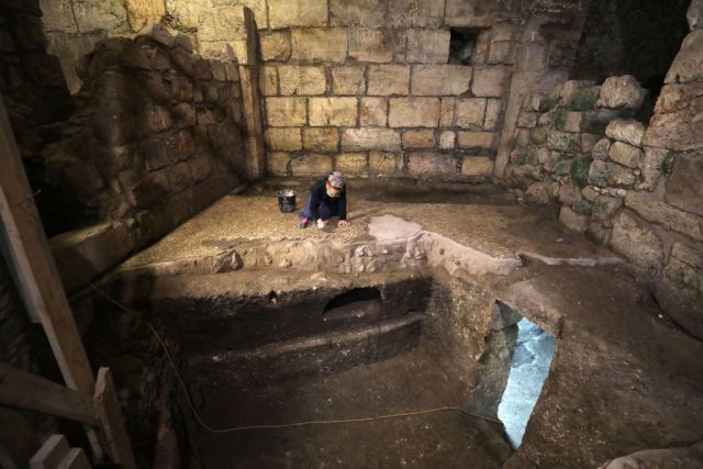 Last year, Israeli archaeologists started excavating a large building that was erected late in the Byzantine era (roughly the 4th to the 14th centuries), according to a report from the Associated Press. The building is located in Western Wall Plaza, about 30 meters from the Wall itself. The building had a plain, white mosaic tiled floor, and when the archaeologists started looking underneath it, they found a series of small chambers had been carved into the bedrock on which the building sits.