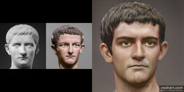 Voshart has tried where possible to deliver his Roman emperors warts and all. “I’ve striven to age them according to the year of death — their appearance prior to any major illness” he writes on Medium. He has also focused on works “where the emperor was stereotypically uglier — my pet theory being that artists were likely trying to flatter their subjects.” Caligula apparently had such a face for radio he would distort his own features for maximum impact on the populace.