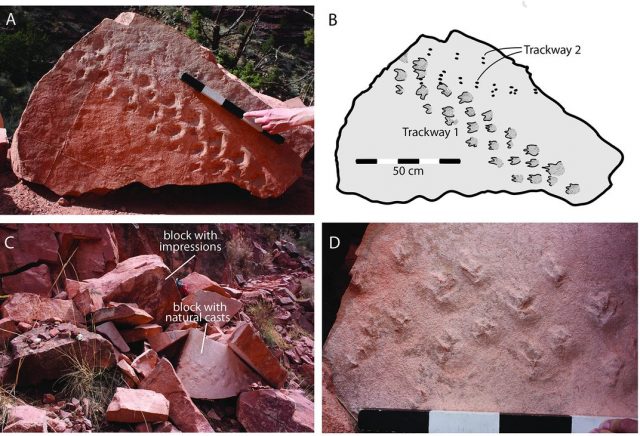 The shape of the tracks led to Rowland’s conclusion that it was a reptile that left them, but whether it was one that crossed the boulder twice, or two separate creatures, Rowland can’t say.