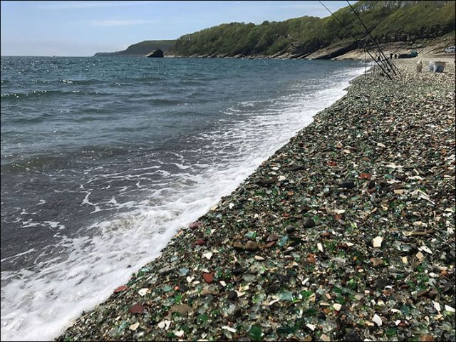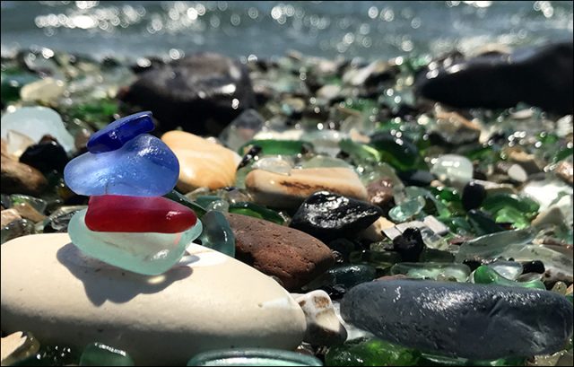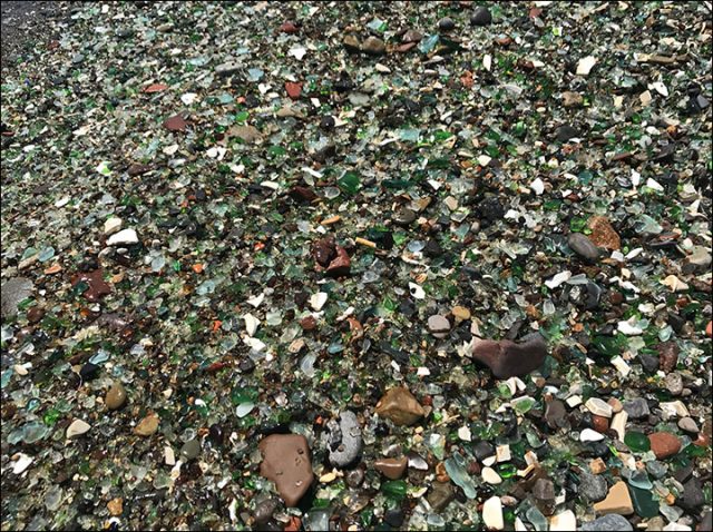 Then, as the tides ebbed and flowed, bits of them were carried back onto the beach from the surf, and gradually the beach became a gorgeous array of glass fragments in lots of different colours – blue, green, red, white and even yellow.