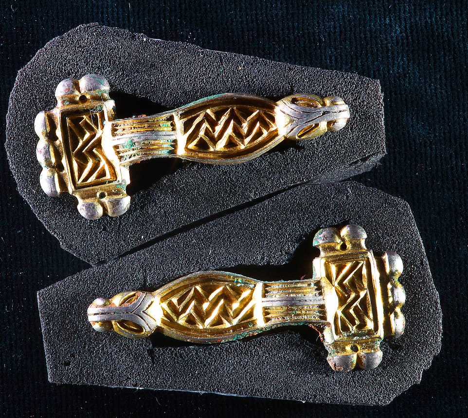 Two fibulae, a clip to fasten a garment, show a highly artistic design merging two colors of metal and another more elaborate fibulae with a scrap of fabric still attached did not fare as well because of the corrosion of the metal from the fabric deteriorating on the front of the clasp.
