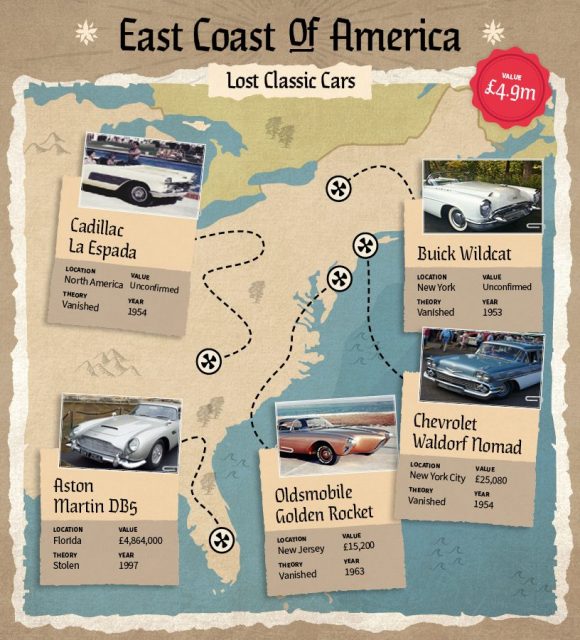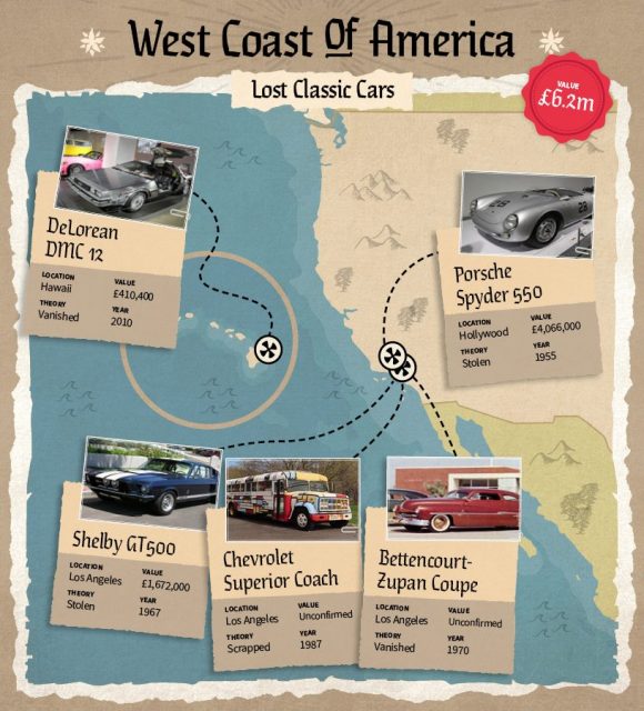 Our map of lost classics shows £114.7m worth of cars lost in different parts of the world. Most of the cars were last seen on the west and east coasts of America, with notable examples including James Dean’s fabled Porsche 550 Spyder and the world-famous DeLorean DMC-12 which featured in the movie Back to the Future. Many also disappeared in Europe, such as the famous Ferrari 375 MM and Bugatti Type 57 SC.