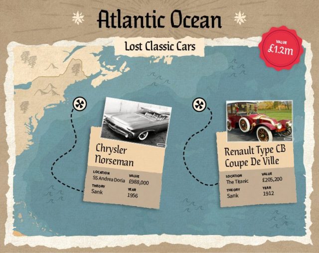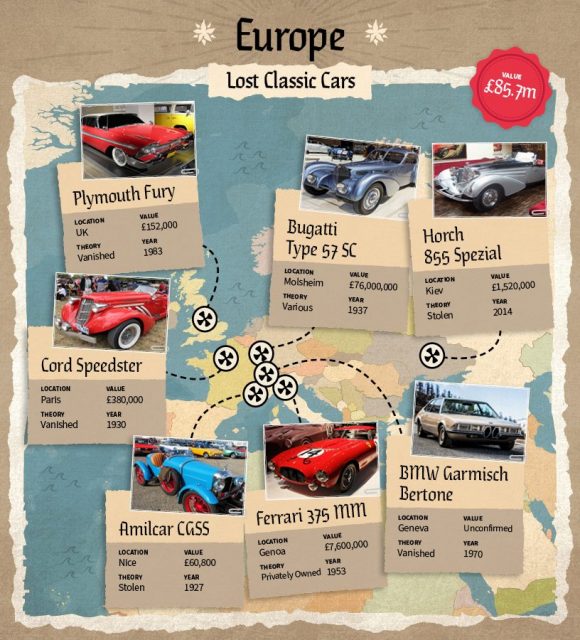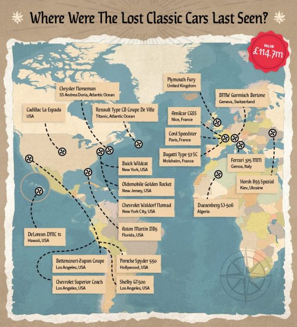 We’ve dug out our treasure map and plotted 20 locations where some of the world’s most famous cars disappeared between 1912 and 2014. Continue to scroll for a zoomed-in view of each continent and to find out more information about each missing car, their approximate values and the unsolved mysteries that surround them. A big thank you to www.selectcarleasing.co.uk for this article.