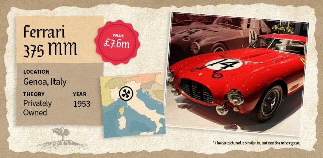 The famous Ferrari 375 MM is another missing car that vanished, this time in 1953. The car was sold to a collector in Genoa, Italy, but hasn’t been seen in over 65 years.