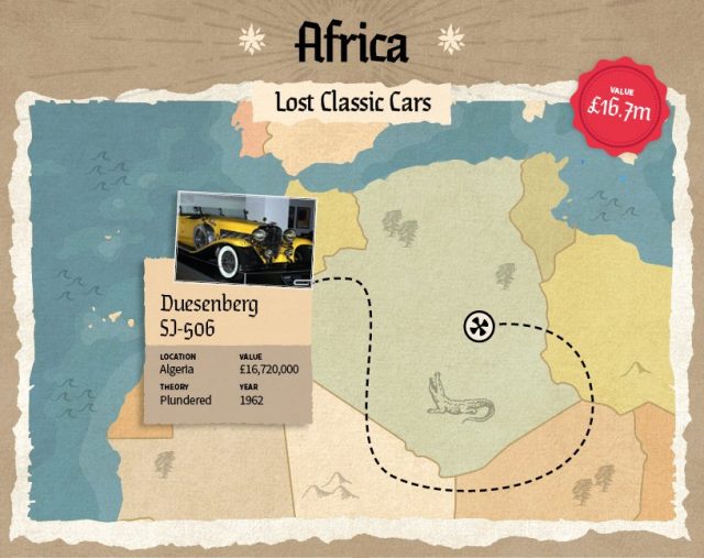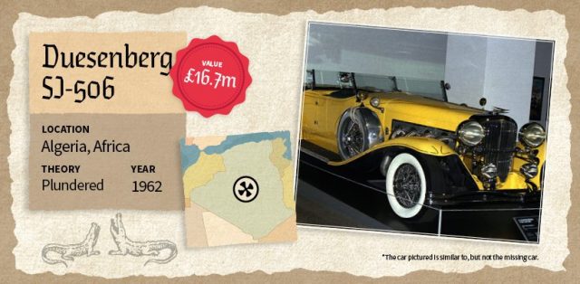 Algeria is the last known location of one of the most famous lost cars in history. During the Algerian civil war in 1962, a Duesenberg SJ-506 went missing when the owner, Emile Beghain, was forced to flee the country.