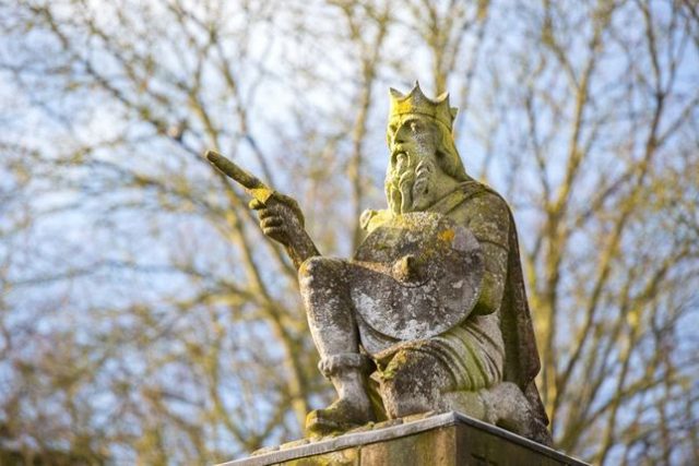 The gatehouse was built from massive blocks of limestone, and has many elaborate – if slightly odd – architectural details, including a large metal figure of war, in a kneeling position, perched on the roof.