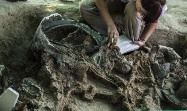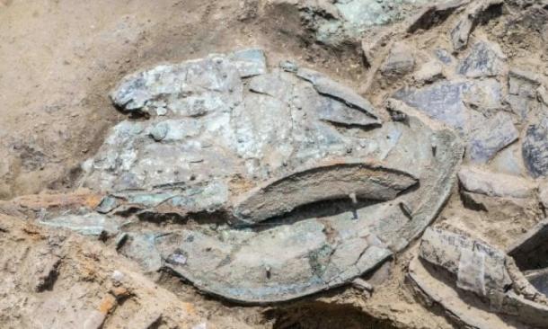The center of the ring was excavated and an iron-wheeled war chariot, a bronze helmet, bronze vessels, a large cache of weapons and iron skewers along with other treasures were recovered.