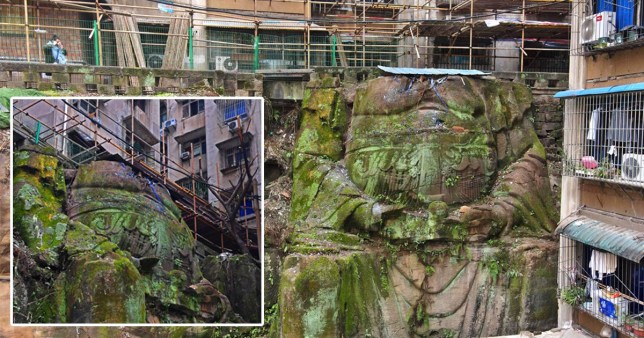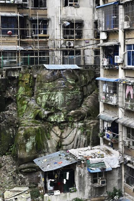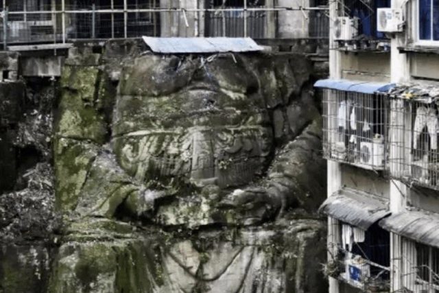 As it’s part of a cliff face, the giant carved sculpture certainly wasn’t going anywhere. Builders agreed and constructed over it. But the Buddha would have stayed a secret, were it not the march of progress that’s provided high rise homes for people in the area.