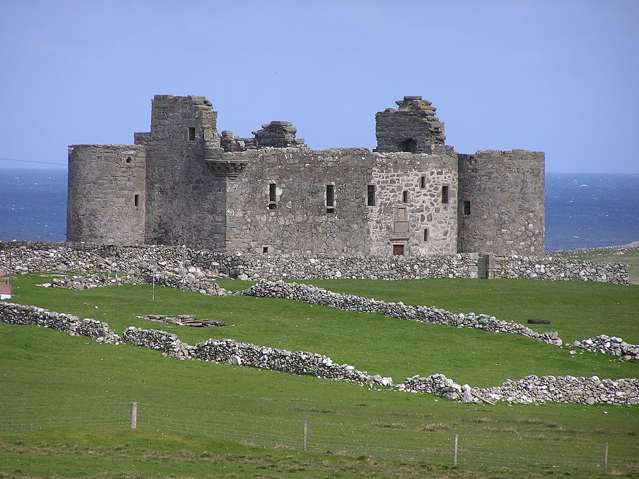 Muness castle, a protected Grade A property which was sacked by French pirates in 1627, is a little over a mile east from the village of Uyeasound and is rectangular in shape seventy three by twenty six feet with towers. While there is no roof, the ground floor and the first story still survive. The third story was dismantled to build a wall around the castle.