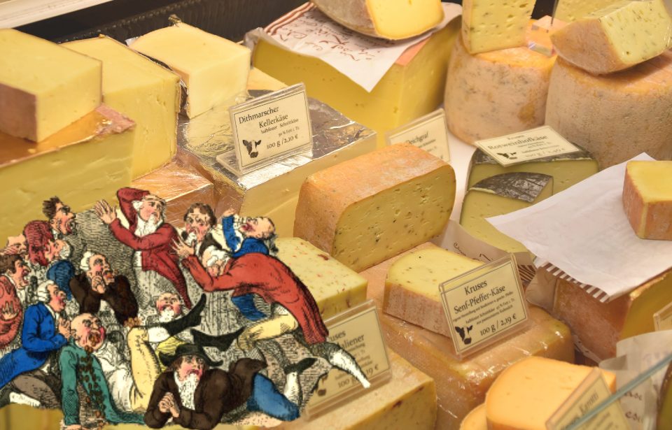 Because cheeses at that time were sold in large wheels roughly the size and shape of a small barrel, many of the looters simply rolled the cheeses down the street — a method that resulted in the mayor himself being knocked down.